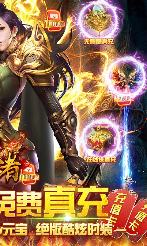 1、上线送vip15,元宝*1000000,金币*10000万、绝版酷炫时装! 2、每日登录送无限真充卡,海量充值无限送,元宝用到手抽筋! 3、充值比例1:5000,首冲最高10倍返利,超值投资千倍返还! 4、最强福利1:无敌资源1000倍返利,开局百亿身家,轻松碾压全场! 5、最强福利2:挂机爆无限真充,刀刀光柱刀刀爆! 6、最强福利3:全新GM特权,福利应有尽有!商城海量资源统统1元宝购买!