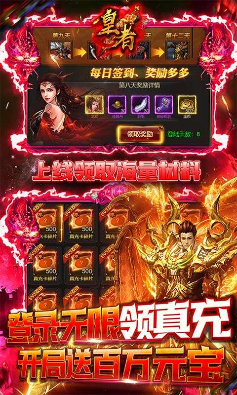 皇者(GM无限爆充)是款传统的经典四职业竖版传奇动作手游!上线领取每日领取无限资源,免费开启GM商城,统统1元宝拿走!开局免费激活百万真充活动,每日全图爆海量真充卡!上百张地图,上百套酷炫时装,更有丰富的跨服玩法,带来走进真正的传奇世界!快来一起战斗吧!