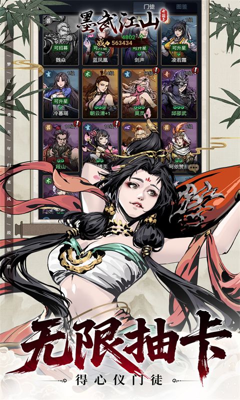 墨武江山是一款以武侠世界为背景的游戏,玩家在游戏里可以体验各种精彩无限的武林故事,游戏里还可以结识各种侠肝义胆的江湖豪侠,和他们一起经历一段获劫富济贫,或斩杀恶人的惊险故事,也可以用邀请与你志趣相投的角色一起前行,在这里武林中闯荡出一番事业。游戏的玩法为经典的卡牌游戏玩法,快来组建你的江湖小分队,和他们一起感受江湖武林的血雨腥风!