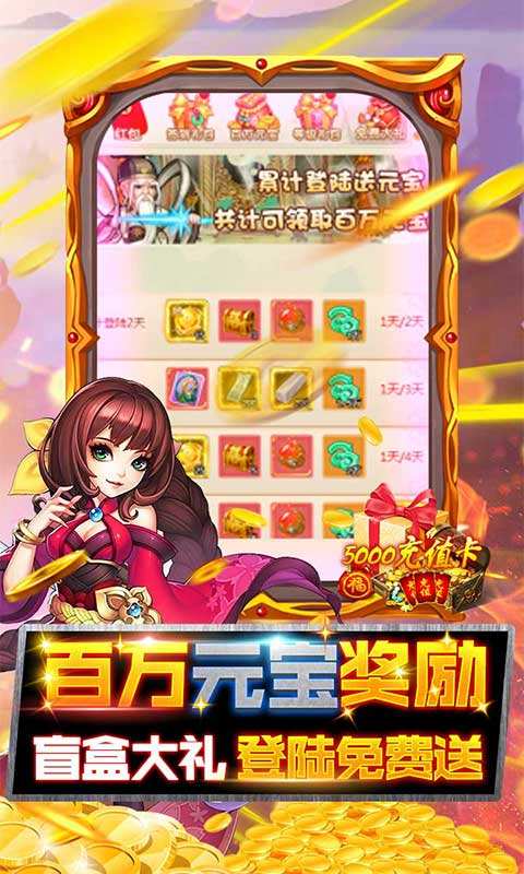 1、上线送满V+5000充值+SSSR混世魔童+20个盲盒+68888元宝! 2、开服7日狂欢,绝版神宠伙伴等你拿! 3、百万元宝奖励,盲盒大礼登陆免费送! 4、开服冲级送豪礼,极品道具盲盒等你来领!