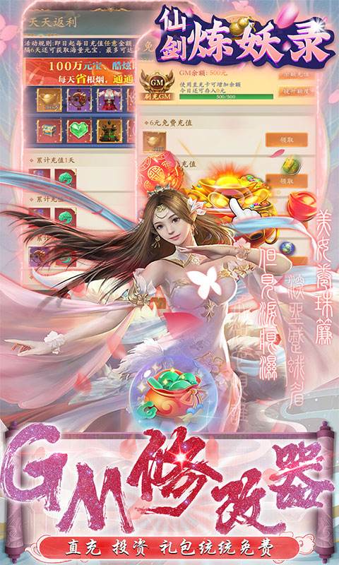 《仙剑炼妖录(GM科技刷充)》是一款以仙侠世界为题材的角色扮演游戏!上线就送VIP20,还有100万元宝以及5000万金币倾情相赠,畅快开局,弹射起步!海量极品神兵、翅膀、装备,炫酷外显,助你成为九州世界最亮的崽。GM修改器玩法震撼来袭,礼包,基金,直充统统免费激活,更可激活线上累充活动,海量道具拿不停!精致的画风给玩家呈现别出一格的线下世界,丰富的养成玩法,特色多样的副本竞技,还能在游戏里与诸多好友一起创建宗门,打造最强修行势力,实力制霸谁与争锋!简单操作,畅快享受,你还在等什么?激情的修仙征途等待你的来临!